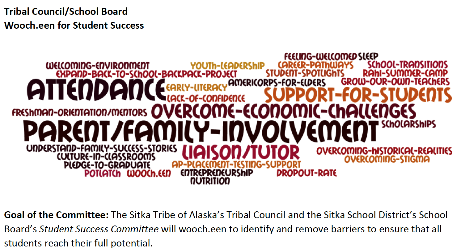 - Wooch.een for Student Success Tribal Council/School Board Committee: During the 2015-16 school year the Sitka School Board created a Board Committee to work towards making our schools more welcoming. The Wooch.een for Student Success committee consists of 2 School Board members, 2 Sitka Tribe of Alaska (STA) Tribal Council members, and other leaders (e.g., Sitka Schools Superintendent, STA's Education and Language Director, etc.). Our goal is to work together to identify and remove barriers to ensure that all students reach their full potential.